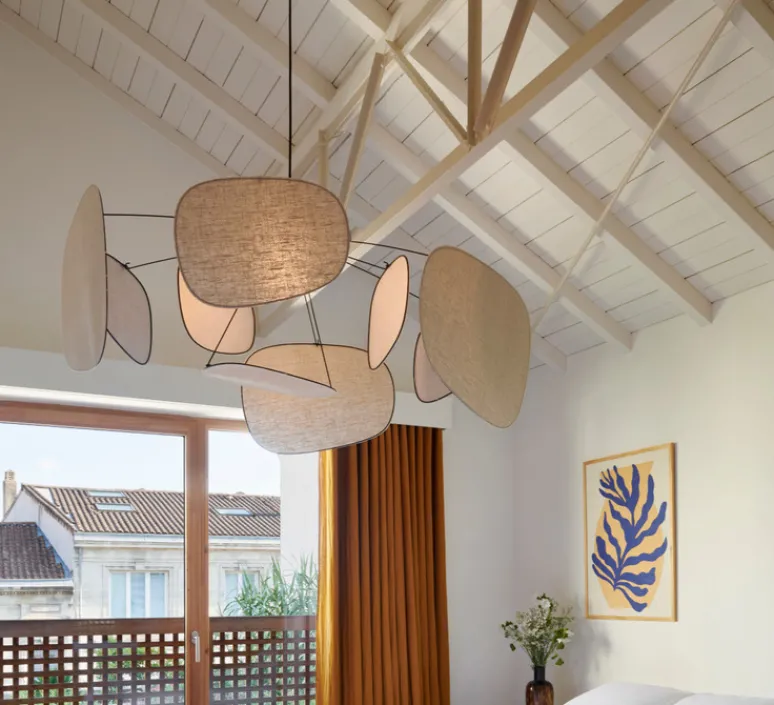 La gamme SCREEN fait voyager dans le temps, avec une toute nouvelle forme d’écrans rétro inspirés du design graphique des années 70. Dans un mix inédit de matières toujours plus cosy, cette nouvelle collection, dessinée et façonnée dans nos ateliers en France, joue sur un équilibre parfait des couleurs et du contraste chaleureux et indémodable de sa palette de tons de terre. La suspension XL est composée d’une structure en métal peint ainsi que de 10 écrans en lin 100% européen bordés en tissu.