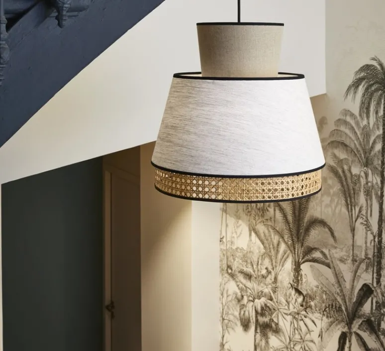 La suspension est composée d’un empilement de 3 abat-jour en lin lavé et cannage. Elle est également équipée d’un cordon textile et d’un pavillon en métal adaptable DCL.