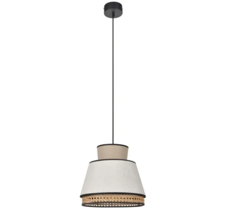 La suspension est composée d’un empilement de 3 abat-jour en lin lavé et cannage. Elle est équipée d’un cordon textile et d’un pavillon en métal adaptable DCL.