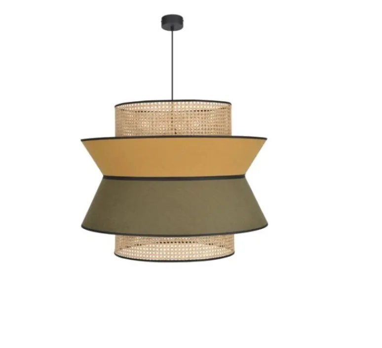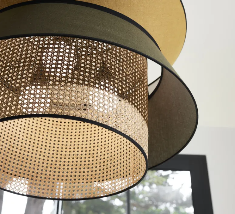 La suspension est composée d’un empilement de 3 abat-jour en lin lavé et cannage. Elle est également équipée d’un cordon textile (2,7m) et d’un pavillon en métal adaptable DCL. Elle mesure 60 cm de hauteur et 78 cm de diamètre.