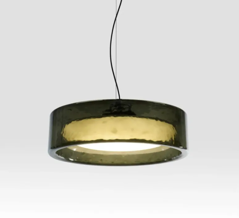 Avec son verre vert en polycarbonate transparent, Ringo évoque un bloc de glace à la fois massif et aérien. Sa forme cylindrique et son volume généreux (Ø70 cm) captent la lumière pour la diffuser en douceur à 360°, créant des jeux d’ombres et de reflets organiques. Elle trouve parfaitement sa place dans des environnements contemporains : halls, hôtels, grands salons ou espaces professionnels, seule ou répétée pour structurer l’espace.