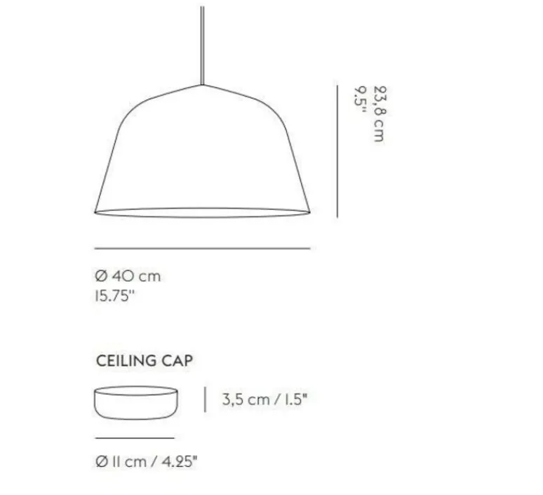 La lampe mesure 40cm de diamètre et 23,8 cm de haut et possède une corde en caoutchouc de 4m, parfaite pour les grandes hauteurs sous plafond. Une rosace blanche est incluse. L’ampoule LED E27 avec une puissance maximale de 11W n’est pas fournie mais est recommandée afin d’obtenir un éclairage optimal, diffusant 2700K (un blanc chaud).