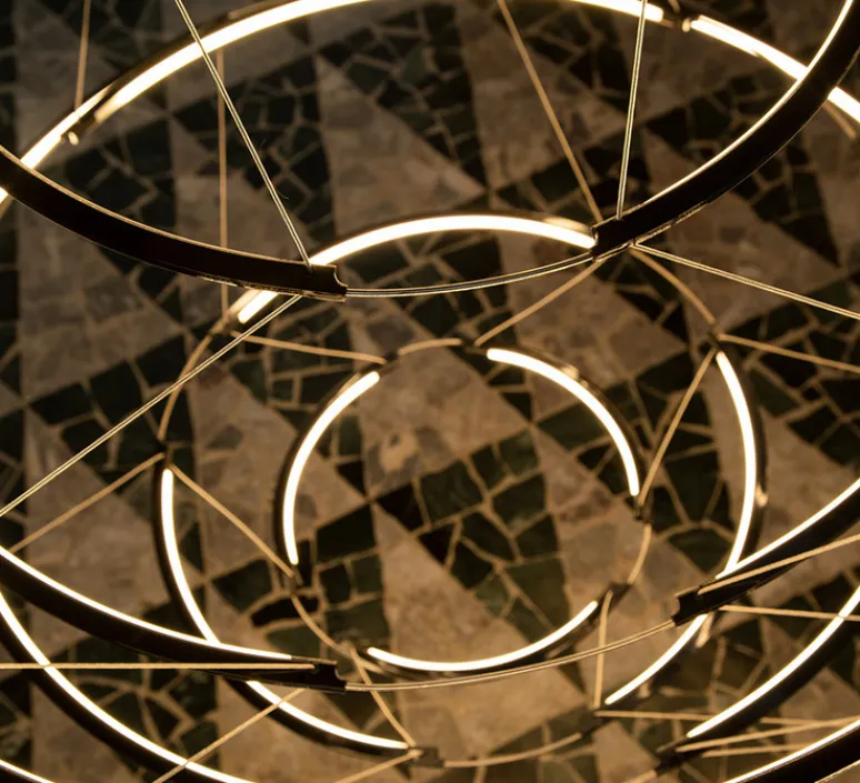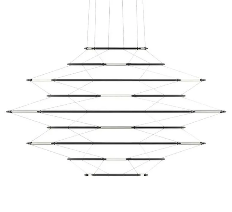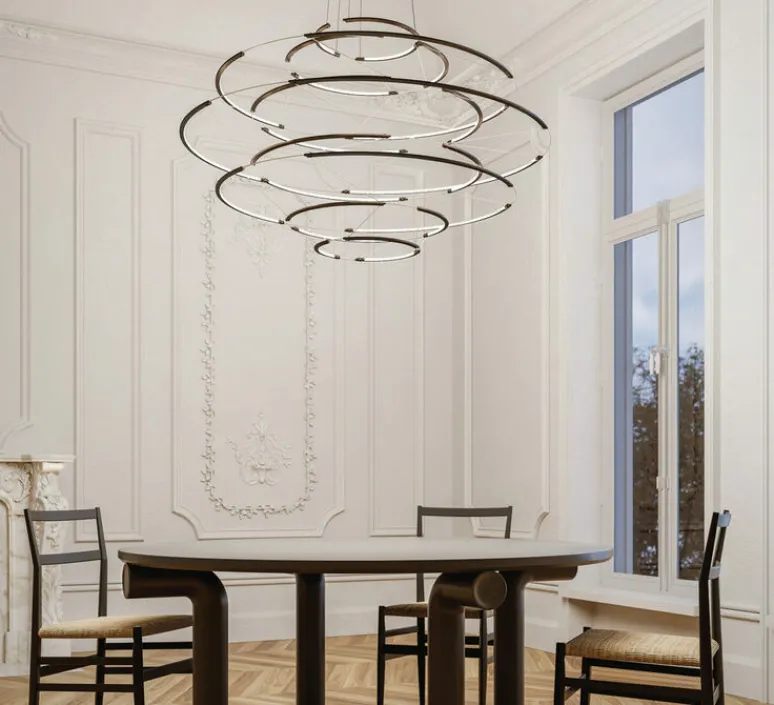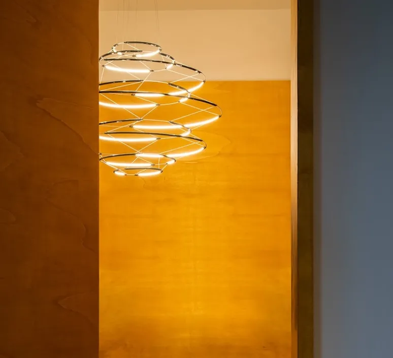 Instinct et recherche constante de conception sont les maîtres mots pour cette collection qui est le résultat d’un travail sophistiqué d’ingénierie d’éclairage. Il s’agit d’un lustre aux lignes définies associées à une structure en aluminium extrêmement légère pour un écho de lumière important et diffus. Chaque profil et contact est relié par une connexion miniaturisée pour un résultat unique de légèreté suspendue.
