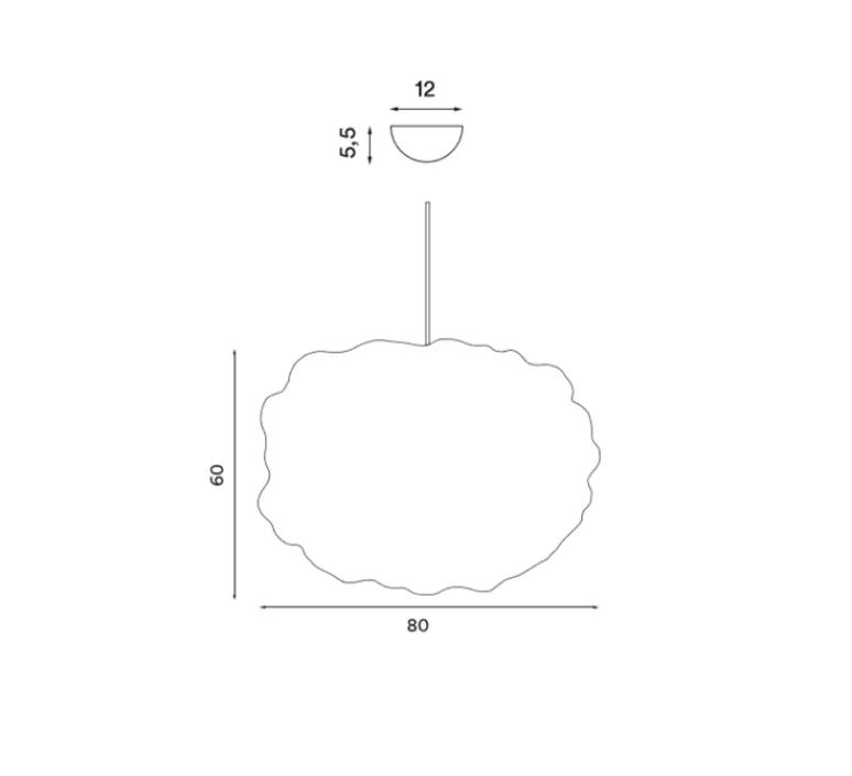 Les dimensions sont de 60 cm de hauteur et 80 cm de diamètre. Le câble noir de 370 cm est fourni avec la lampe. Le poids est de 2,1 kg. L’ampoule n’est pas fournie : E27, maximum 100W. La rosace est de 12 cm de diamètre et 5,5 cm de hauteur.