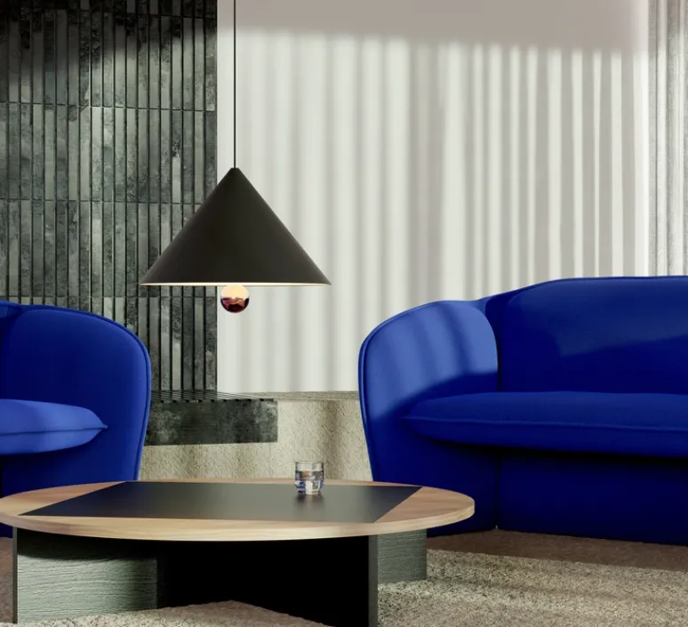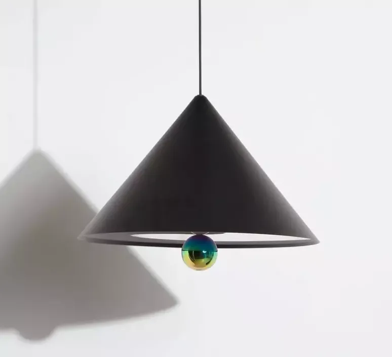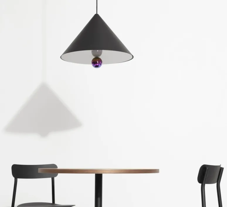 La suspension Cherry représente une vision épurée et simpliste alliée à un design minimal. Le cône en aluminium reprend les codes du mouvement Memphis, avec des couleurs sobres comme le noir et blanc ou extravagantes avec du vert menthe et brun-rouge.