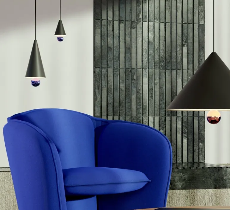 La suspension Cherry représente une vision épurée et simpliste alliée à un design minimal. Le cône en aluminium reprend les codes du mouvement Memphis, avec des couleurs sobres comme le noir et blanc ou extravagantes avec du vert menthe et brun-rouge.