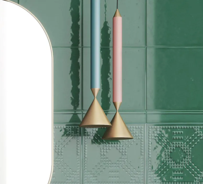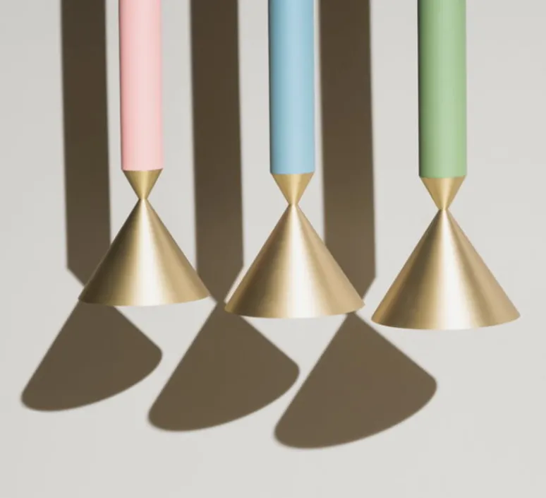 L’assemblage de formes coniques qui s’équilibrent les unes sur les autres et soulignent la force descendante d’une lampe suspendue et créent une expression à la fois dynamique et statique.