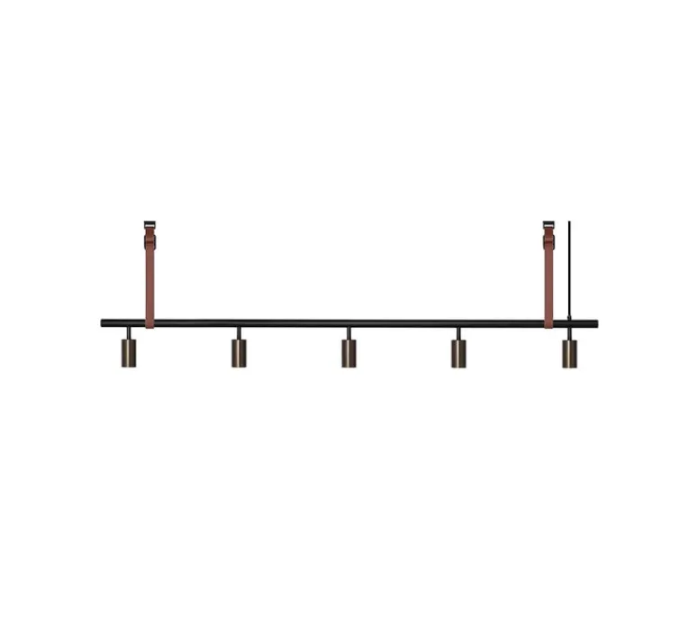 Avec ses lignes épurées et son mélange de matériaux de qualité, cette suspension incarne l’élégance scandinave. Sa teinte noire, accentuée par cinq spots en finition bronze et une sangle en cuir marron, en fait un ajout parfait à tout intérieur contemporain.