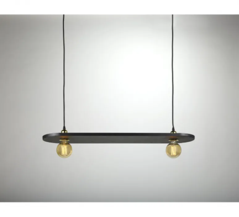 Très élégante, cette suspension se compose d’une simple plaque en bois noir aux angles arrondis. De plus deux câbles en acier gainé, sont fixés, rejoignant des socles qui peuvent être allongés ou raccourcis en fonction de vos préférences.