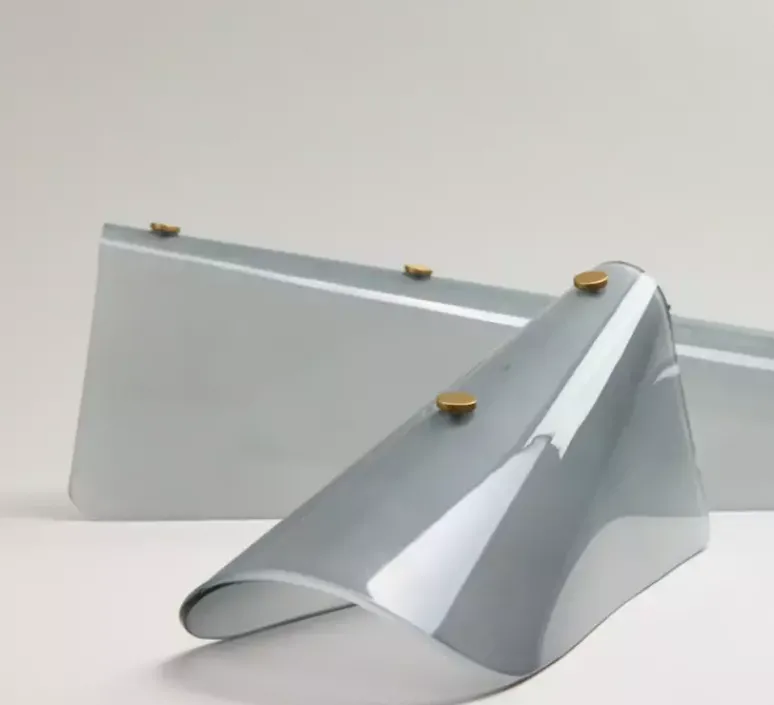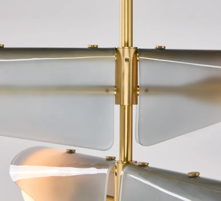 Ses ailes en verre gris, courbées avec délicatesse, se déploient autour d’un cadre en laiton brossé, évoquant la qualité translucide des graines et illuminant chaque espace d’une lueur douce et chaleureuse.