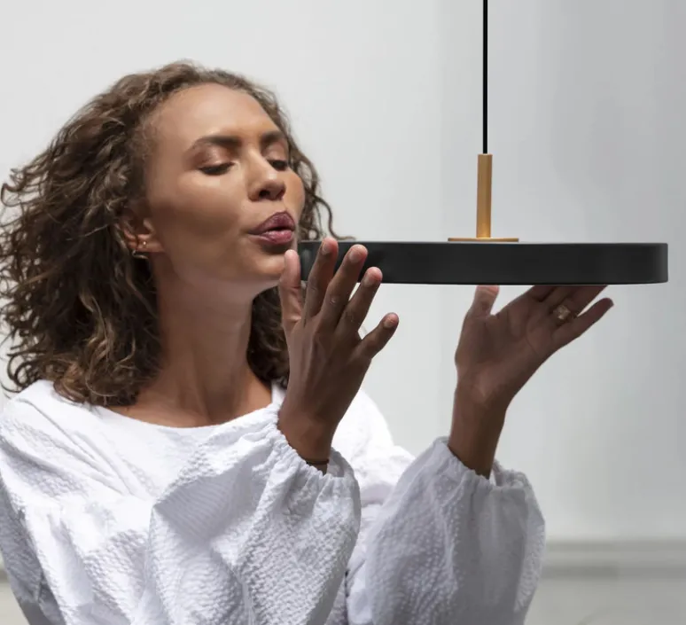 Avec son design minimaliste et son coloris noir, l’Asteria Plus incarne une élégance intemporelle. Son panneau LED intégré diffuse une lumière douce et homogène, et le bouton discret situé sur le dessus permet d’ajuster la température de la lumière en fonction de vos besoins – que ce soit pour travailler avec concentration ou créer une ambiance apaisante. De plus, elle est compatible avec un variateur externe pour un contrôle supplémentaire. La suspension Asteria Mini a été conçue par Søren Ravn Christensen pour la maison d’édition danoise Umage.