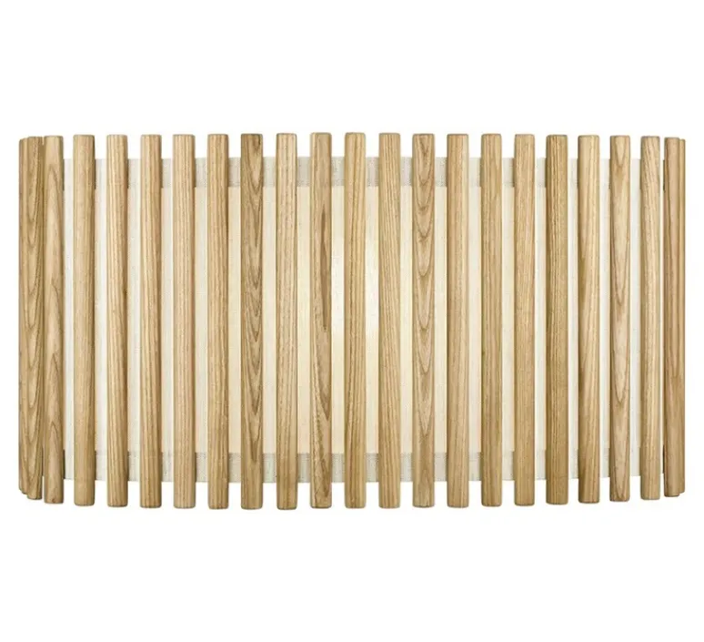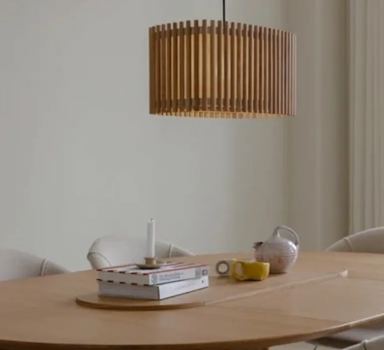 La suspension Komorebi composée de tissus et de lamelles de bois, est aussi disponible en couleur chêne foncé, et en taille medium. Le produit est composé de son abat-jour ainsi que de son câble.