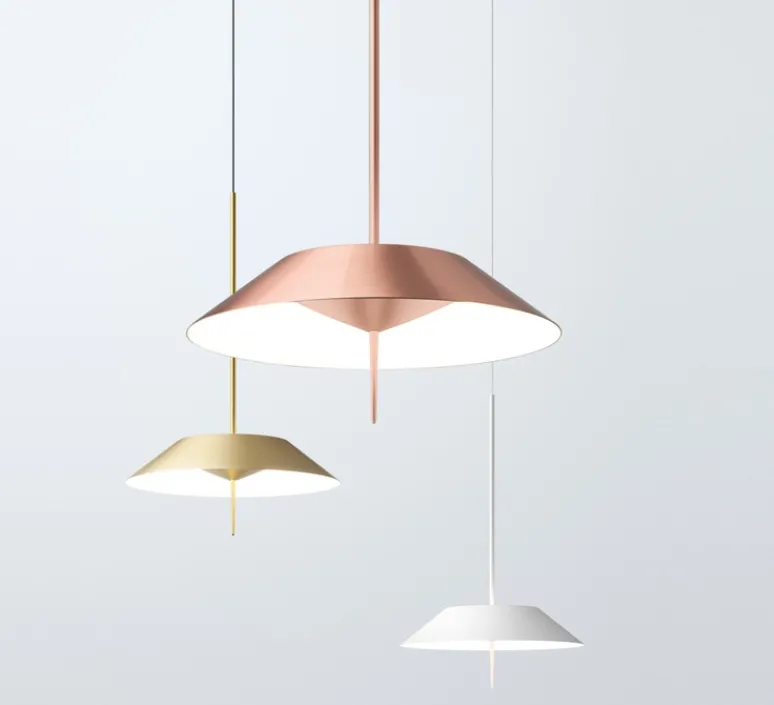 Voici la suspension Mayfair en coloris or de la maison espagnole Vibia ! Mélangeant un style contemporain, voire industriel avec une touche d’élégance, ce luminaire convient à tout type de projet !