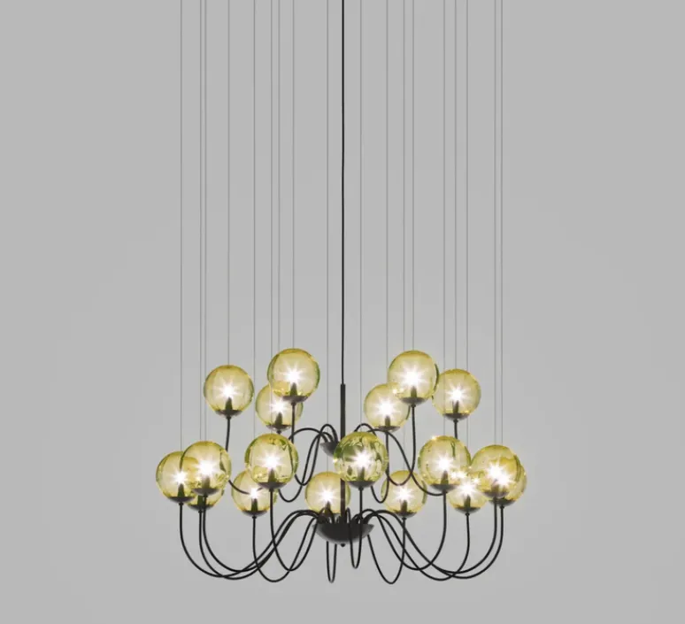 Le verre ambre transparent, strié de façon irrégulière, capte la lumière et crée des effets visuels changeants selon l’angle de vue. Puppet SP 18 devient un point focal idéal dans un espace de vie, une salle à manger ou un hall d’entrée à grande hauteur sous plafond. Les câbles en acier permettent de jouer avec les volumes en suspendant les diffuseurs à des niveaux différents, pour une composition sur mesure.