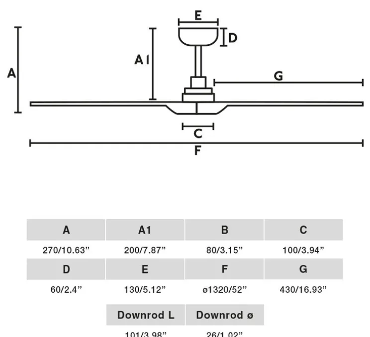 La fixation du ventilateur au plafond est sur rotule. Ce ventilateur mesure Ø132 cm de diamètre et 27 cm de hauteur. La source lumineuse est incluse.
