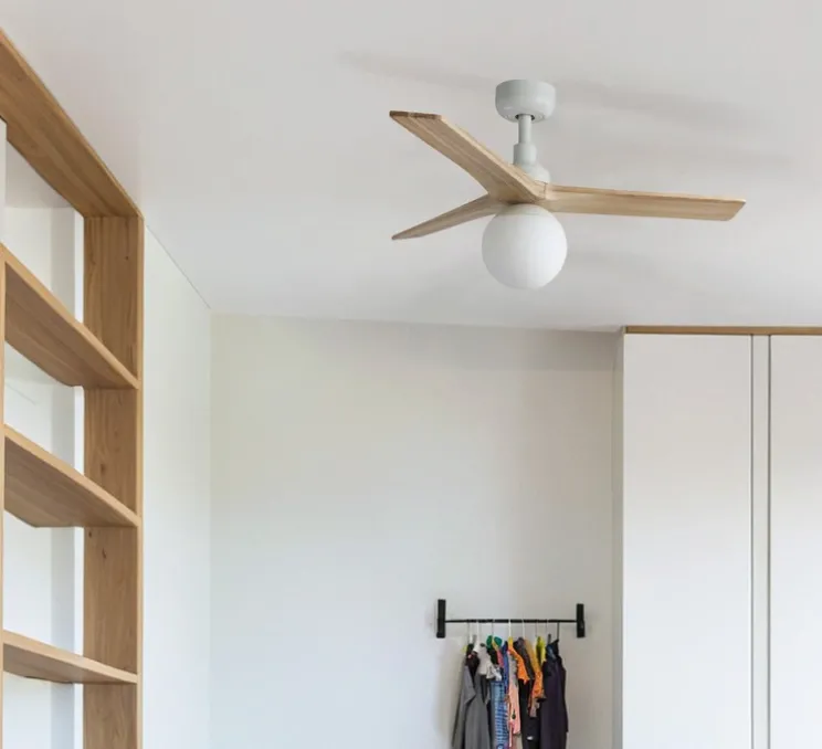 Le ventilateur de plafond Klim, avec ses pales en pin torsadées autour d’un moteur blanc, allie esthétisme et fonctionnalité. Son design raffiné apporte une légèreté visuelle tout en assurant une efficacité remarquable.